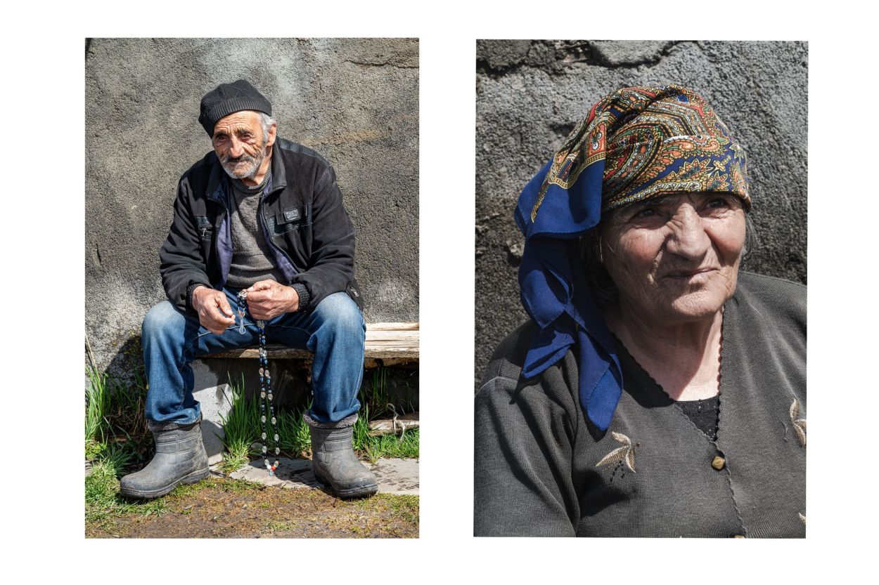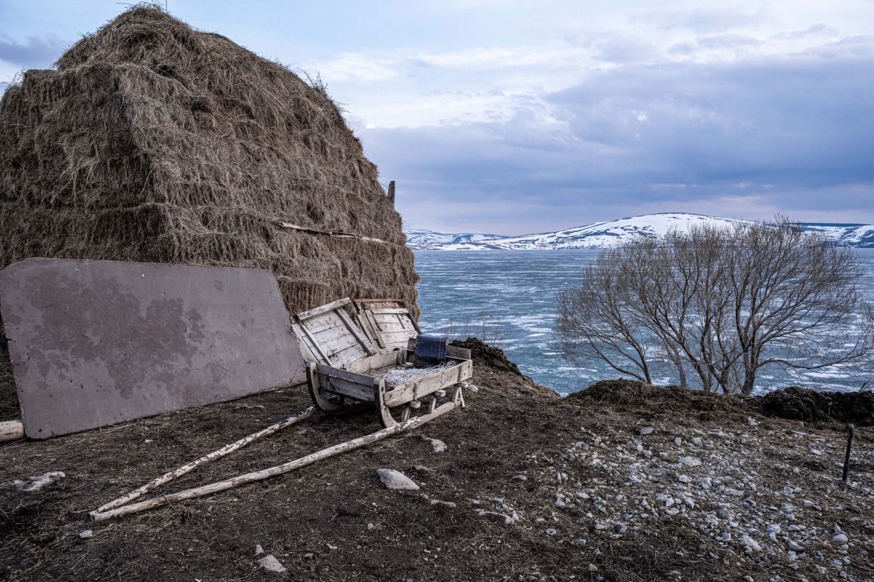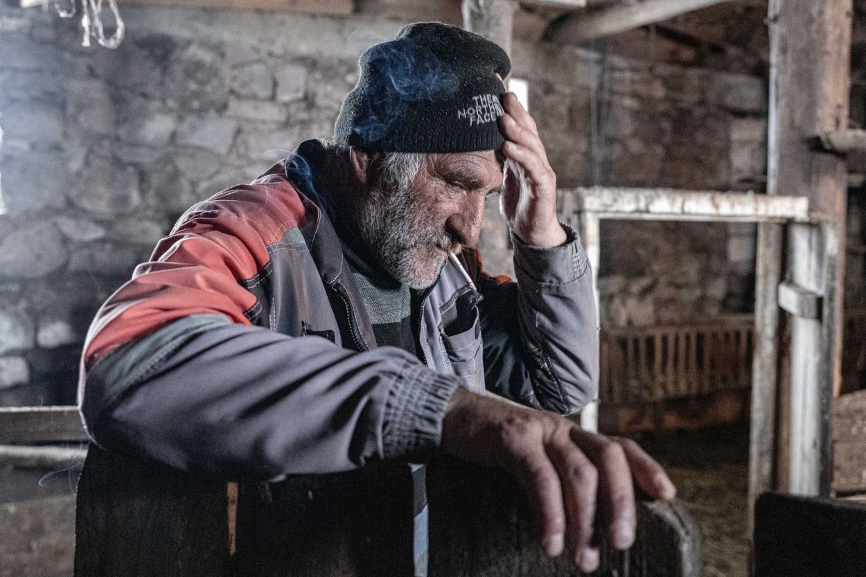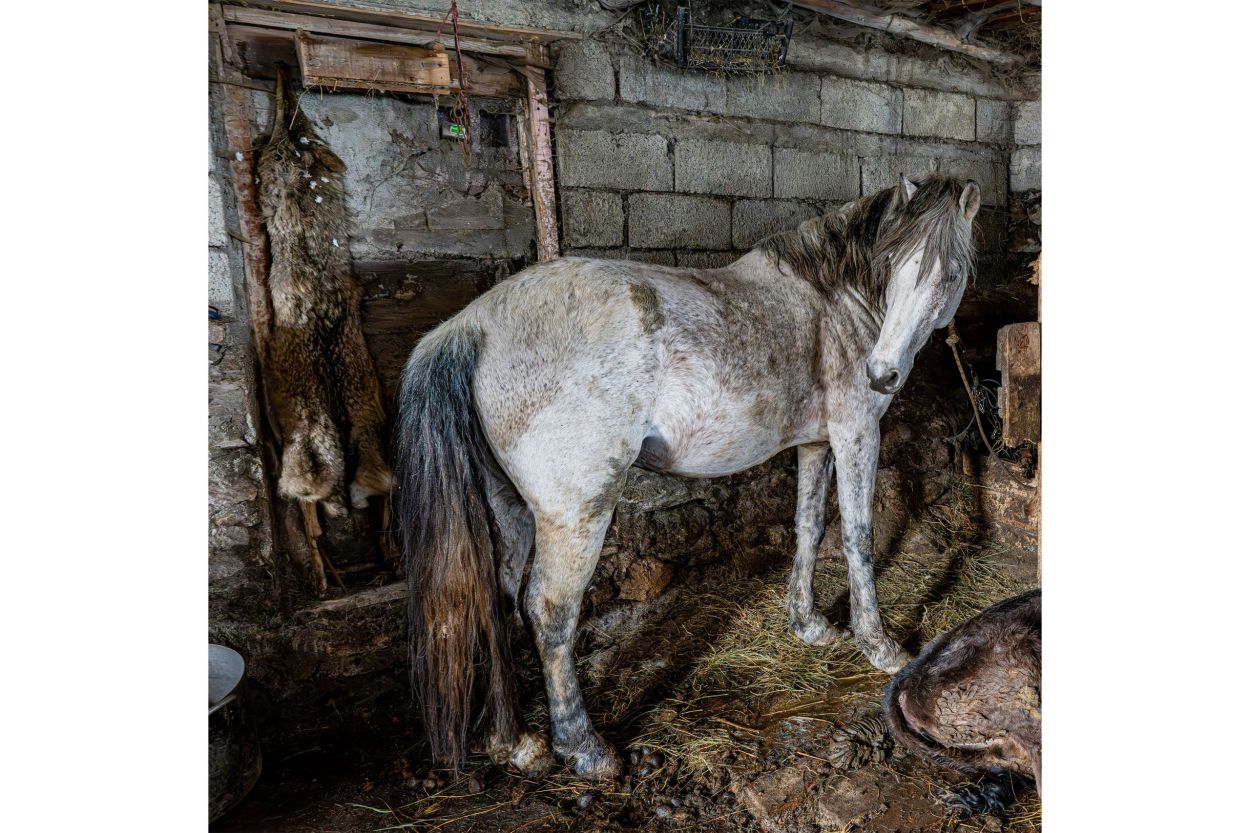 Money is scarce. Oranges from Batumi are traded for cheese. Another trader with a minibus full of trinkets trades his goods for kilos of potatoes to sell later at the market in Tbilisi. Milk is picked up at the barn doors to be taken to the cities. From high atop the lampposts, the storks watch stoically and quietly form their opinions. Around noon, the men of the village gather at the entrance of the little shop. Here, regional news and daily gossip are shared. As far as language allows, the people here are open and hospitable. They enjoy being photographed and are proud of what they have. Without realizing it, I took a picture of a wolf in a stable yesterday. I framed and focused on the horse, and then saw him in the left corner of my viewfinder. The empty pelt of a wolf against a wall. When I wanted to photograph it more clearly, the farmer intervened and quickly made it clear that it was not allowed. “Prison, prison,” he said, laughing and pointing at himself. A friendly poacher I’d gladly join someday.