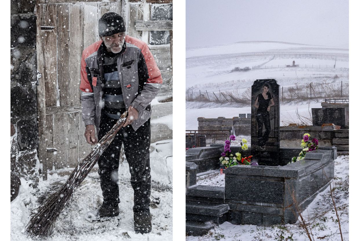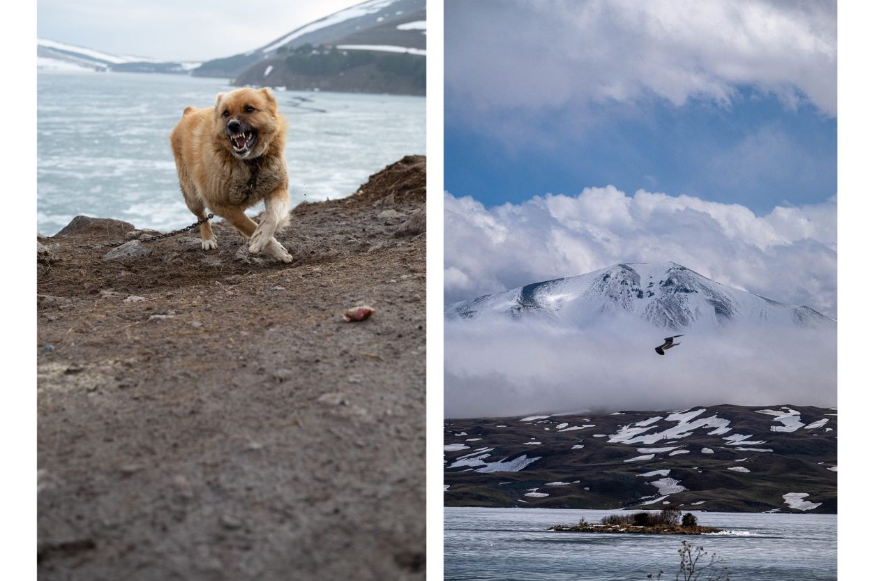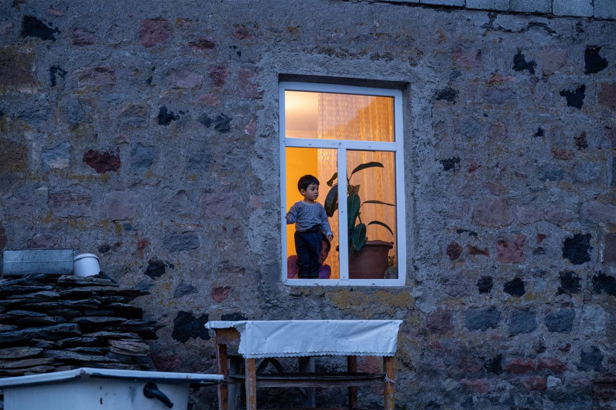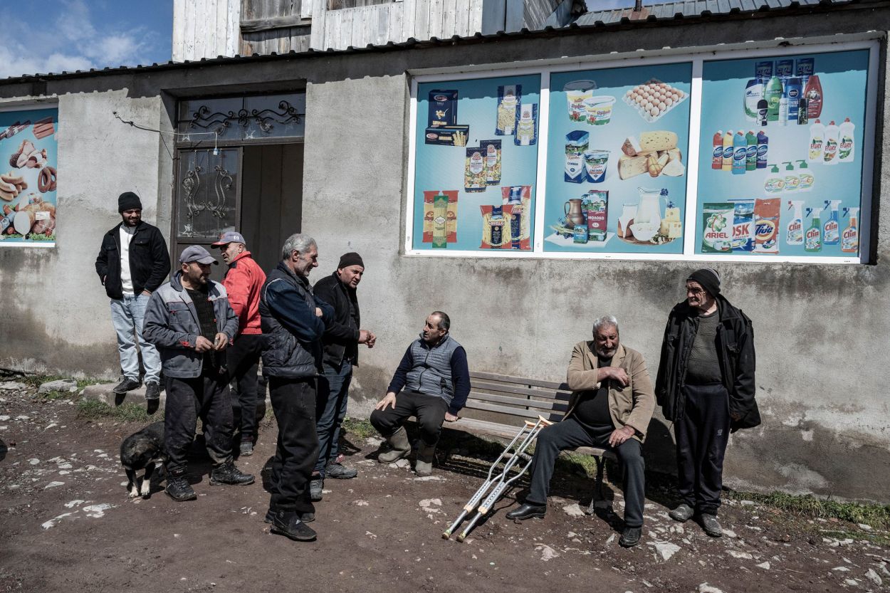 Money is scarce. Oranges from Batumi are traded for cheese. Another trader with a minibus full of trinkets trades his goods for kilos of potatoes to sell later at the market in Tbilisi. Milk is picked up at the barn doors to be taken to the cities. From high atop the lampposts, the storks watch stoically and quietly form their opinions. Around noon, the men of the village gather at the entrance of the little shop. Here, regional news and daily gossip are shared. As far as language allows, the people here are open and hospitable. They enjoy being photographed and are proud of what they have. Without realizing it, I took a picture of a wolf in a stable yesterday. I framed and focused on the horse, and then saw him in the left corner of my viewfinder. The empty pelt of a wolf against a wall. When I wanted to photograph it more clearly, the farmer intervened and quickly made it clear that it was not allowed. “Prison, prison,” he said, laughing and pointing at himself. A friendly poacher I’d gladly join someday.